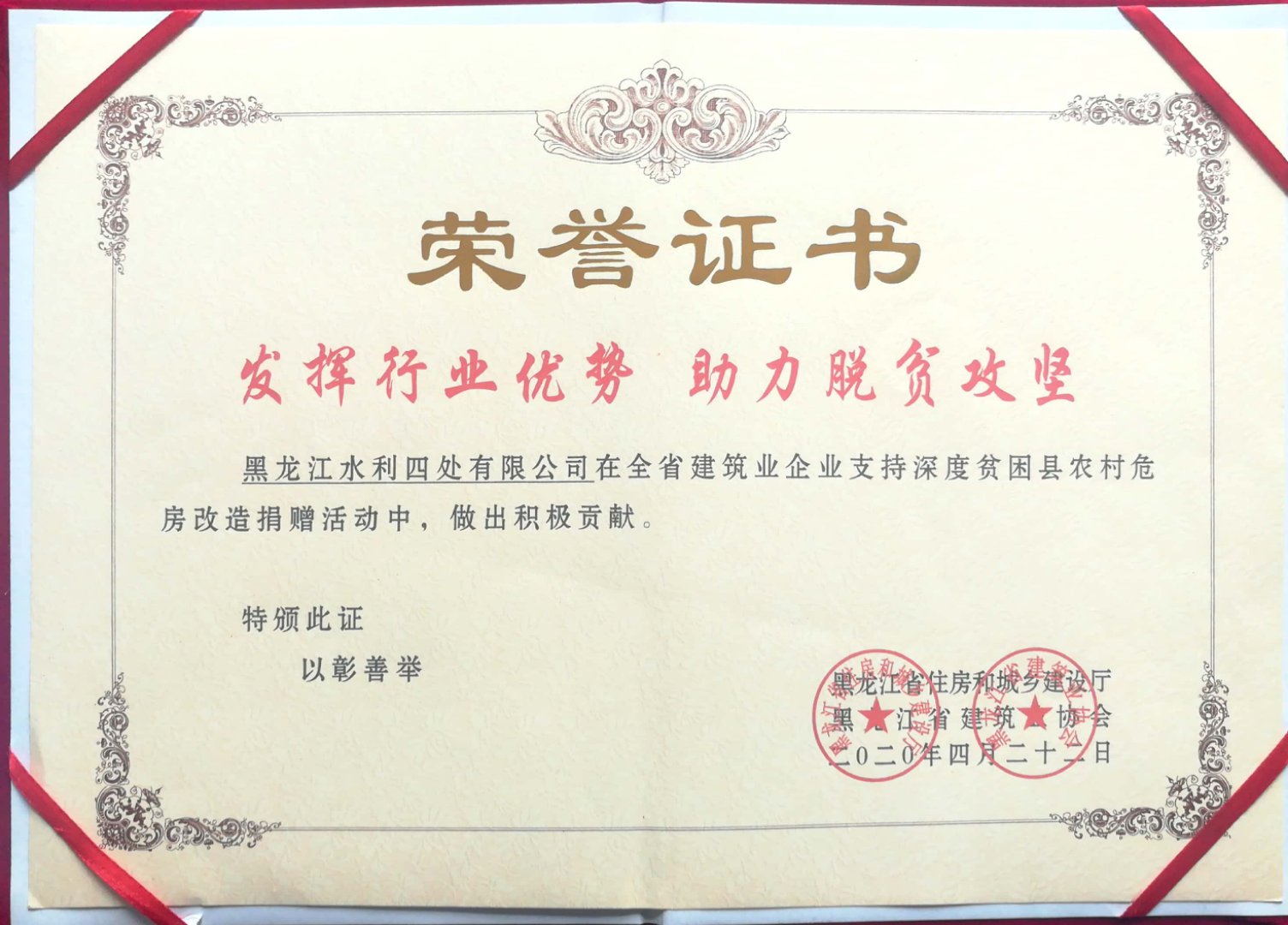 為了發(fā)揮行業(yè)優(yōu)勢(shì),助力脫貧攻堅(jiān),今年四月份黑龍江省住建廳及黑龍江省建筑業(yè)協(xié)會(huì)發(fā)起全省建筑業(yè)企業(yè)支持深度貧困縣農(nóng)村危房改造愛心捐贈(zèng)活動(dòng),我公司積極參與,奉獻(xiàn)愛心,合計(jì)愛心捐款兩萬元,用于支持我省深度貧困縣農(nóng)村危房改造。