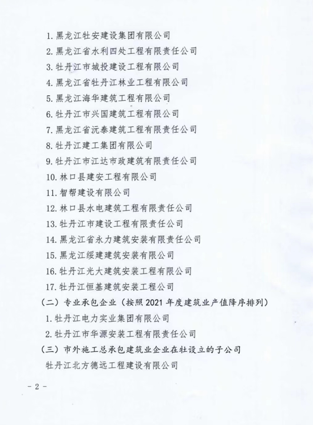 近日,牡丹江市住房和城鄉(xiāng)建設(shè)局下發(fā)文件牡建政發(fā)【2022】27號《關(guān)于印發(fā)牡丹江市重點(diǎn)建筑企業(yè)名單(第一批)的通知》,我公司霍然躋身全市施工總承包重點(diǎn)企業(yè)行列,名居前二甲。